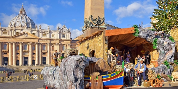 A man in Italy wants to stay away from prison. He hides in a Christmas scene. He stays still like a statue.