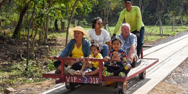 The bamboo trains are homemade. People call them ‘norries’. They are powered by motorcycle engines. They can carry up to 15 people.