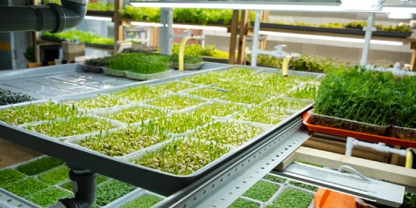 Difficult words: microgreens (young leaves of some vegetables or plants), carbon neutral (an activity makes less gasses and it removes them from the air), medium (a mixture of material where a plant lives).