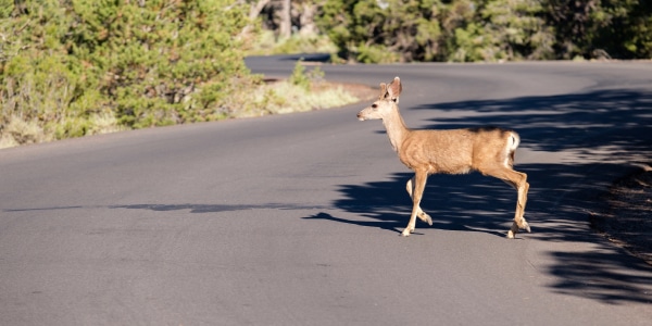 Kentucky is a state in the USA. A police car is on a road there. A deer runs across the road. It hits the police car. The driver starts to brake. The car does not change its course. This is safe. This is a good example to people.