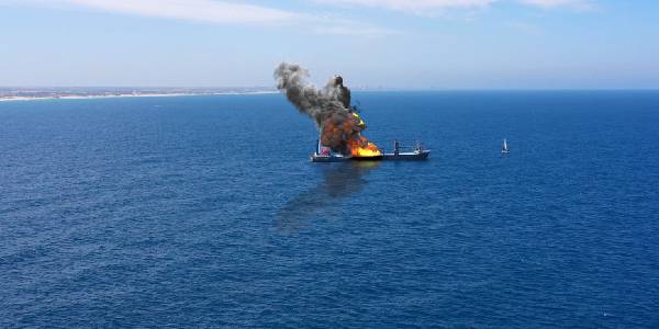 A fire starts. It spreads very quickly. People run away. 153 cars and trucks are on the ship. They stand very close to each other. People can’t pass through.