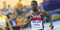 Dwain Chambers is a sprinter. He is very fast. He is British. He is 38 years old. He races against a horse. They race on a 100-metre track. The man starts out faster than the horse. However, the horse gets close behind him soon.