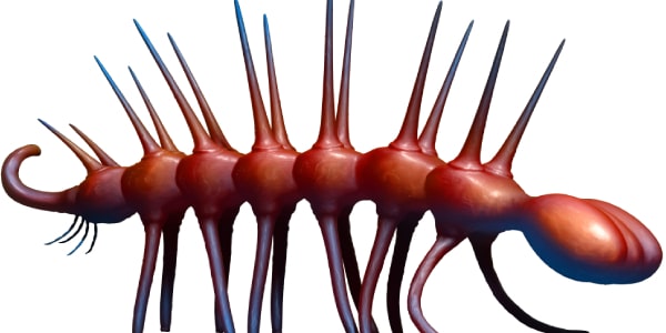 They put the fossils in an electron microscope, initially hoping to find eyes, but they were astonished to find teeth smiling back at them. The animal is known as Hallucigenia and had a worm-like formation. It was about 5 centimetres long, had seven pairs of legs ending in claws, and long spines sprouting from its back.