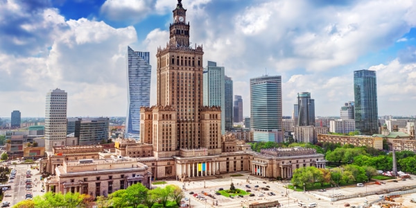 What do the new buildings being built near the square represent in terms of Warsaw's history?