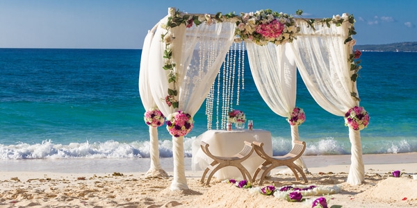 The bride, groom and the whole wedding party were still drying off while the guests arrived for the wedding.