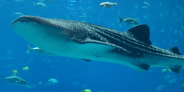 This news is about the whale shark. It is very big. It weighs up to 18 tonnes. It is between 6 to 16 metres long. It is big, but it is not dangerous. It only eats very small fish and plankton.