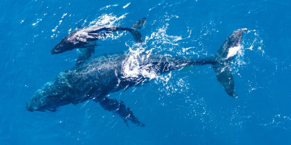 In shallow waters east of Brisbane, a humpback whale was stranded. She was with her calf which tried to help her. It tried to push her out of the shallow water.